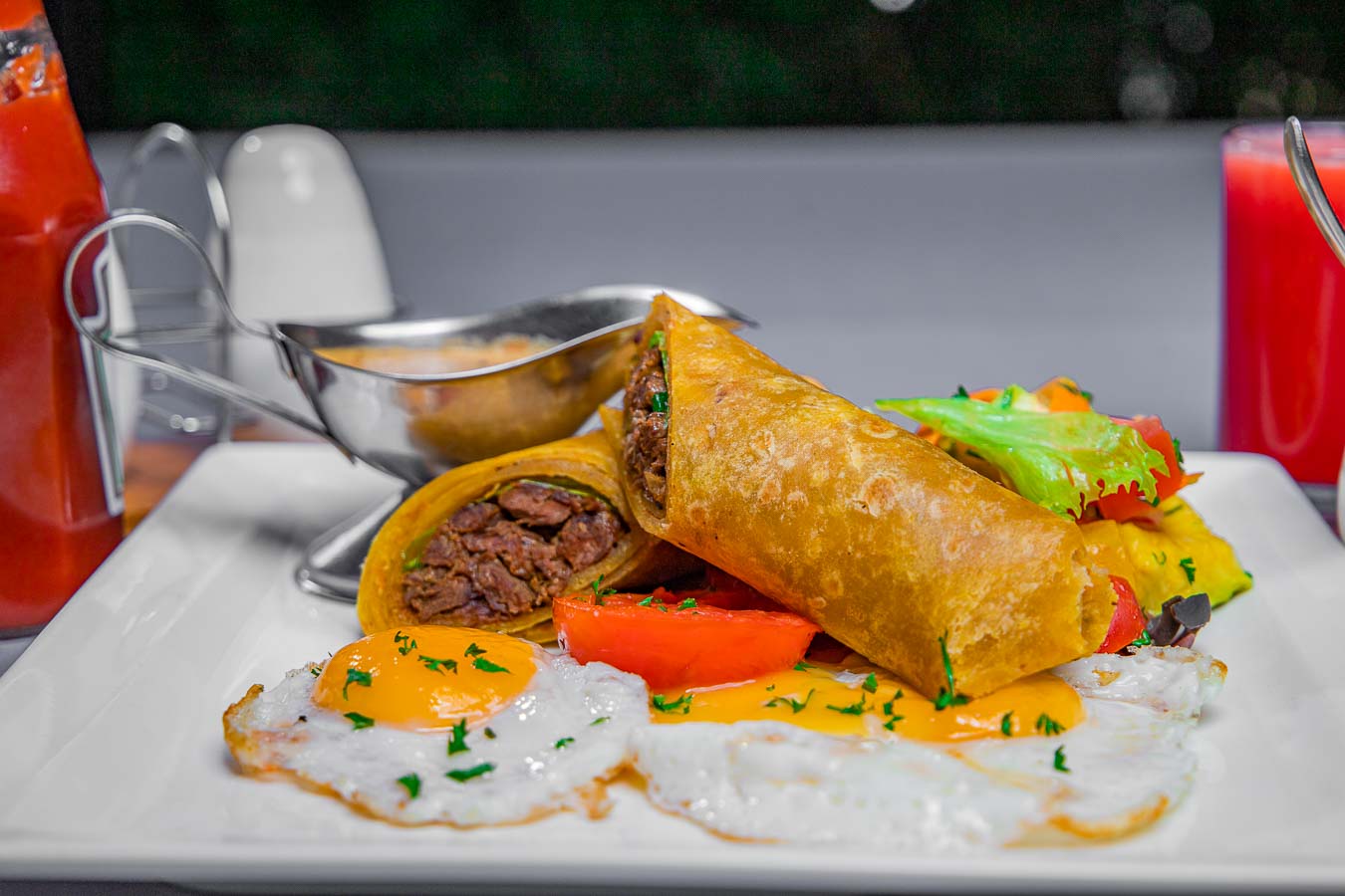 Beef strips cooked in pepper sauce, rolled in fresh chapatti, iceberg lettuce, served with egg of your choice, fresh tomato and avocado salad.